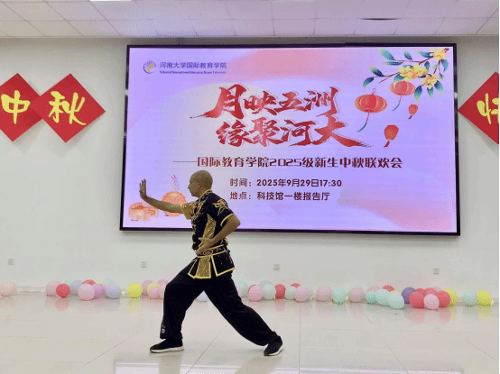 才艺展示环节将联欢会推向高潮。白马可表演的太极拳行云流水,刚柔并济的武术招式赢得阵阵喝彩;刘汴京演唱的豫剧《朝阳沟》选段韵味十足,带大家领略中原戏曲的独特魅力;越南新生带来的送福舞蹈,以精美的民族服饰和灵动的舞姿,展现了别具特色的东南亚中秋文化。