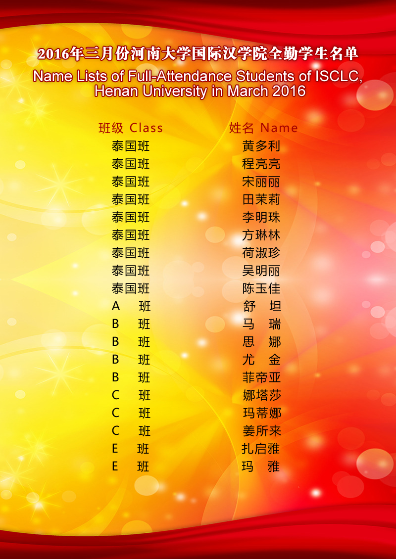 2016年3月份明陞m88官方网站地址国际汉学院全勤学生名单