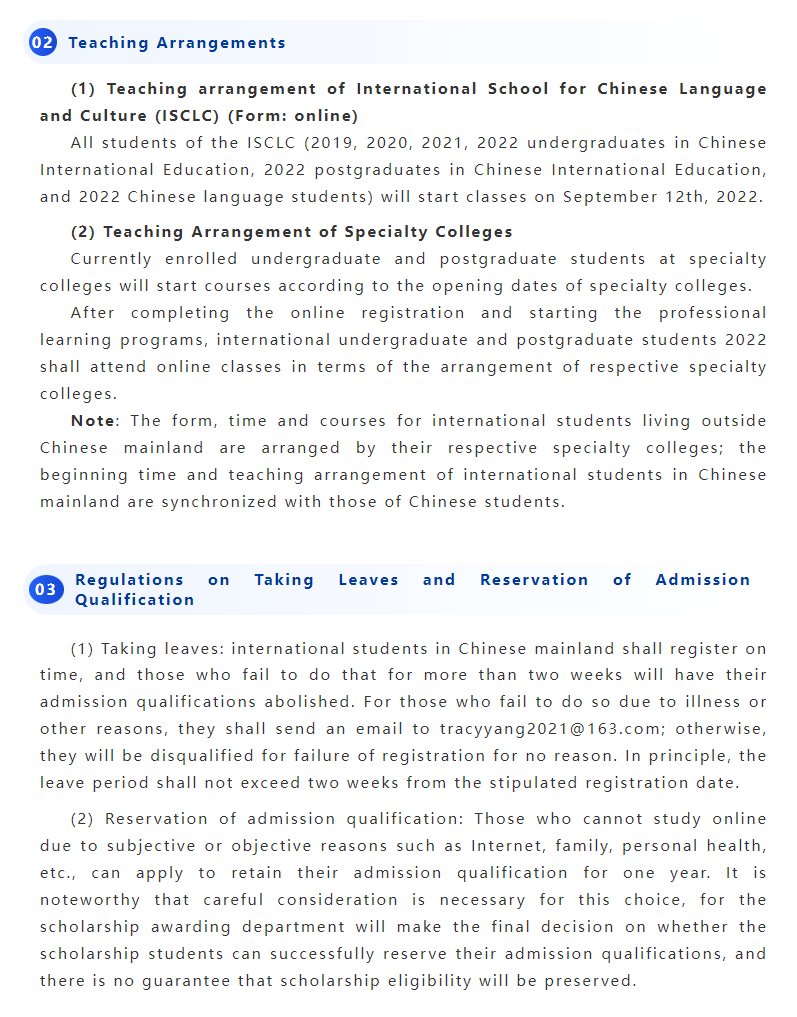 (一)请假:中国大陆境内国际学生须在规定日期内报到注册,逾期未报到超过两周者,取消其入学资格。因病、因事等原因不能在规定日期报到者,须提前发送请假邮件至tracyyang2021@163.com,否则一律作无故不报到处理,取消入学资格。请假期限从规定报到日期起算原则上不超过两周。