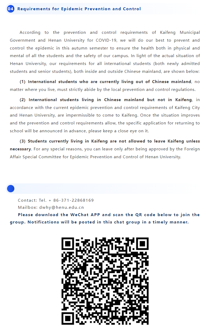 根据当前开封市疫情防控形势,依据开封市及明陞m88官方网站地址有关工作要求,为做好秋季开学疫情防控工作,确保广大学生身心健康和校园安全,结合学校实际情况,对境内外所有国际学生(包括新录取学生和老生)要求如下: