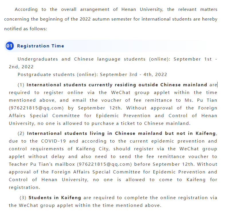 Notification on Beginning of 2022 Autumn Semester for International Students of Henan University