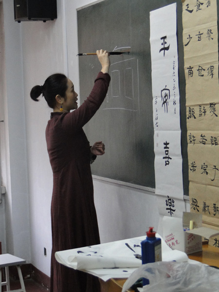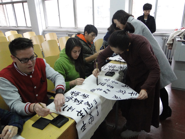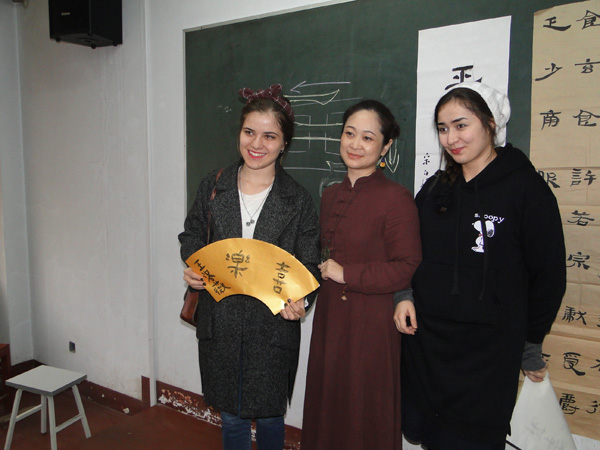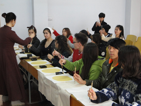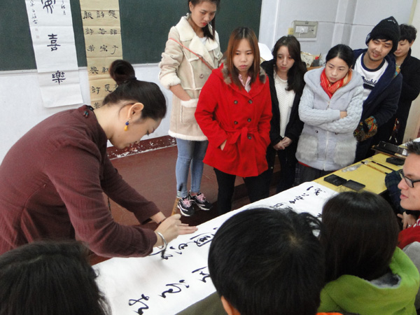 11月11日下午,国际汉学院邀请开封市书著名的书法家宋白娟老师为明陞m88官方网站地址进行了一场书法表演。宋老师为明陞m88官方网站地址们讲解了中国书法也叫毛笔书法和软笔书法,需要的工具笔、墨、纸、砚,也就大家常说的文房四宝。宋老师还为同学们讲解毛笔的构成、拿笔姿势和书写方法,同学们都亲自拿起毛笔进行书写。通过这次体验活动,同学们进一步了解了中国书法是一门古老的汉字的书写艺术,经过几千年的发展依然散发着艺术魅力。