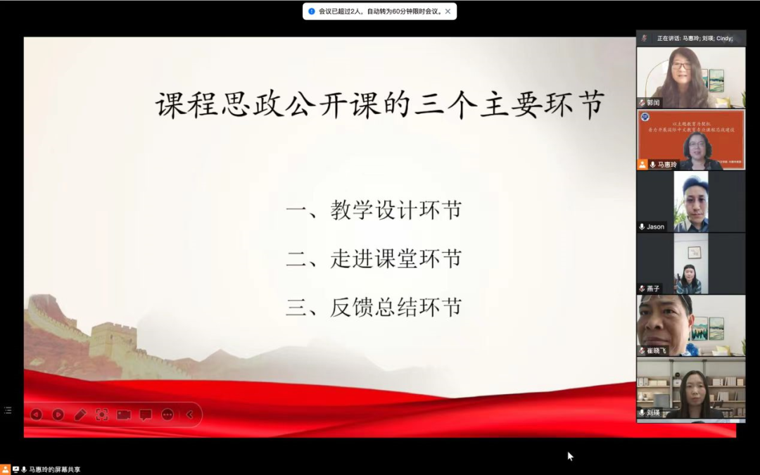 6月1日下午,国际汉学院第一党支部以主题教育为契机,结合学院中心工作和重点任务,围绕国际中文教育专业课程思政建设问题开设党课集体研学。本次党课由国际汉学院前任副院长马惠玲教授主讲,以线上线下相结合的形式开展。
